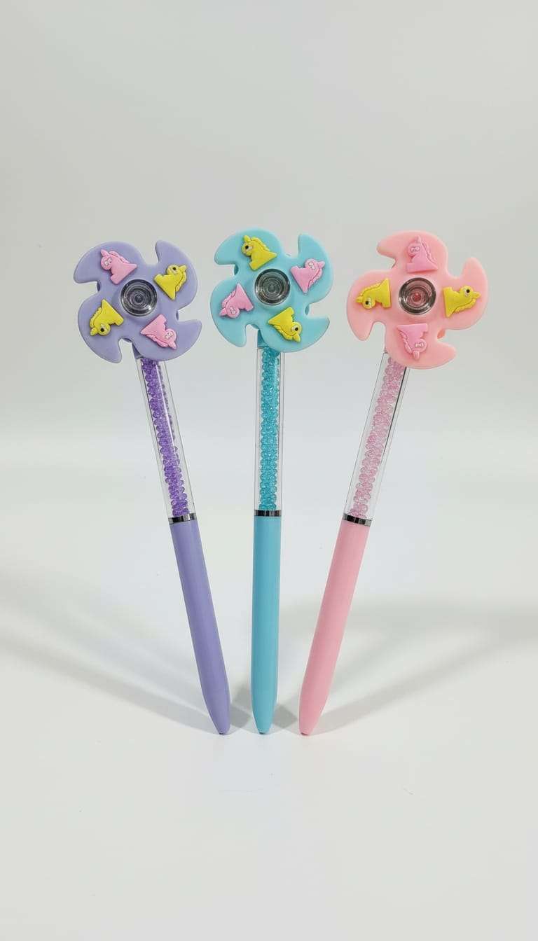 A playful 3-in-1 ballpoint pen featuring a unicorn fidget spinner and a glittery crystal barrel. Ideal for party favors, school rewards, and gift sets.